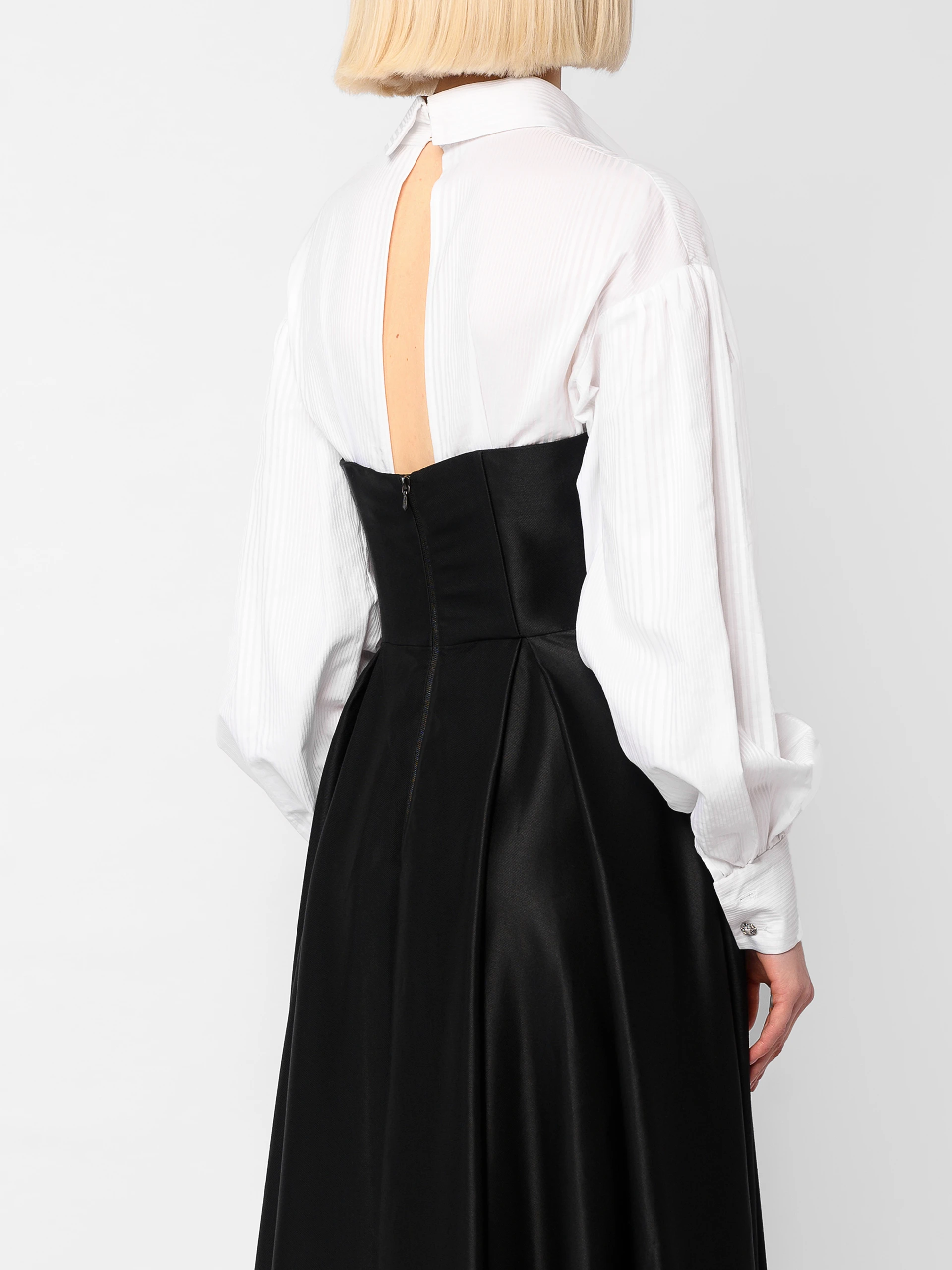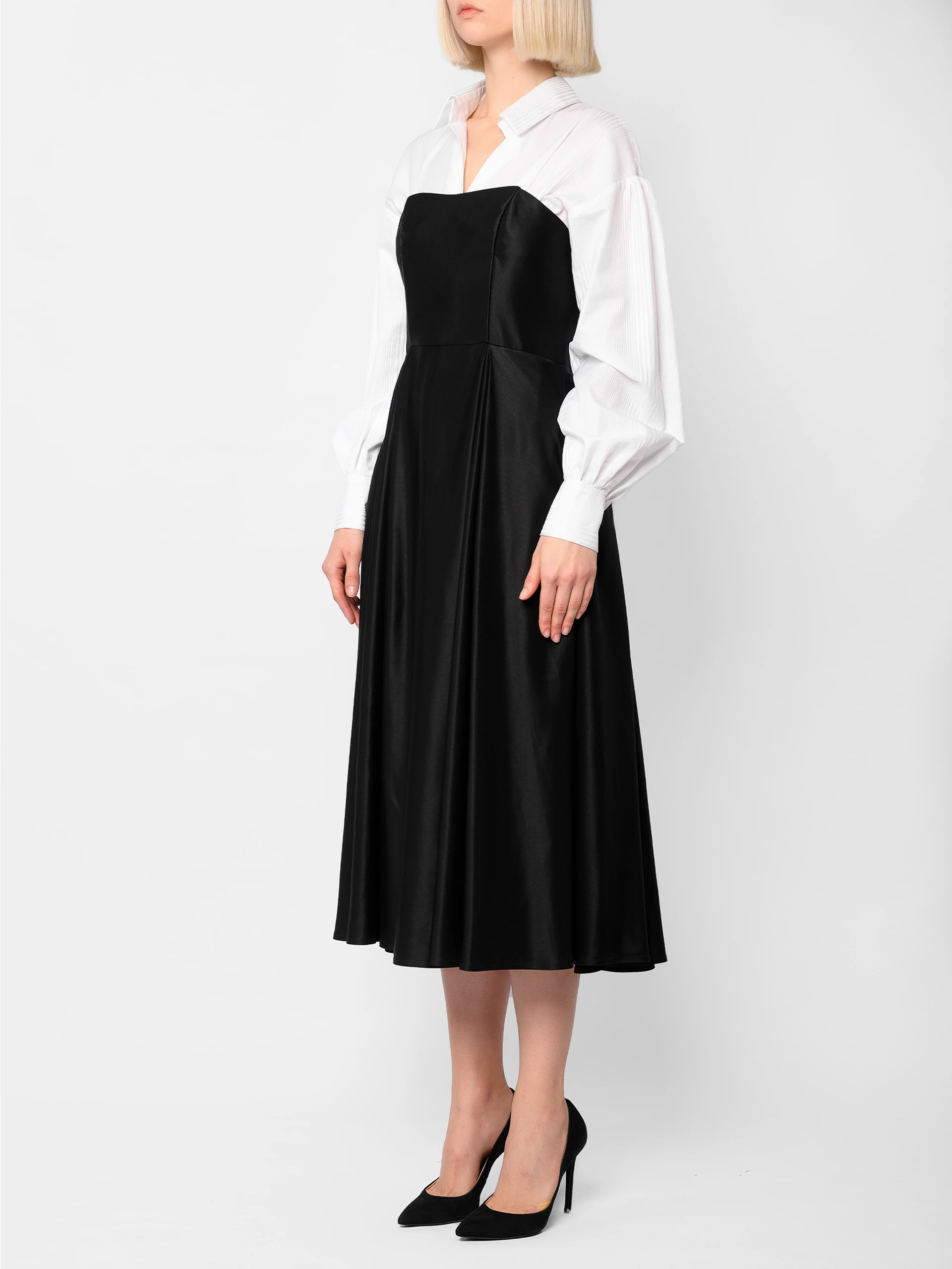 Seamlessly transition from work to evening with The Nine to Nine Dress, a sophisticated fusion of a sleek black wrap dress layered over a crisp white shirt. Designed for the modern woman on the go, this effortlessly chic ensemble balances tailored structure with fluid movement, making it perfect for office meetings and after-work gatherings alike. With its timeless silhouette